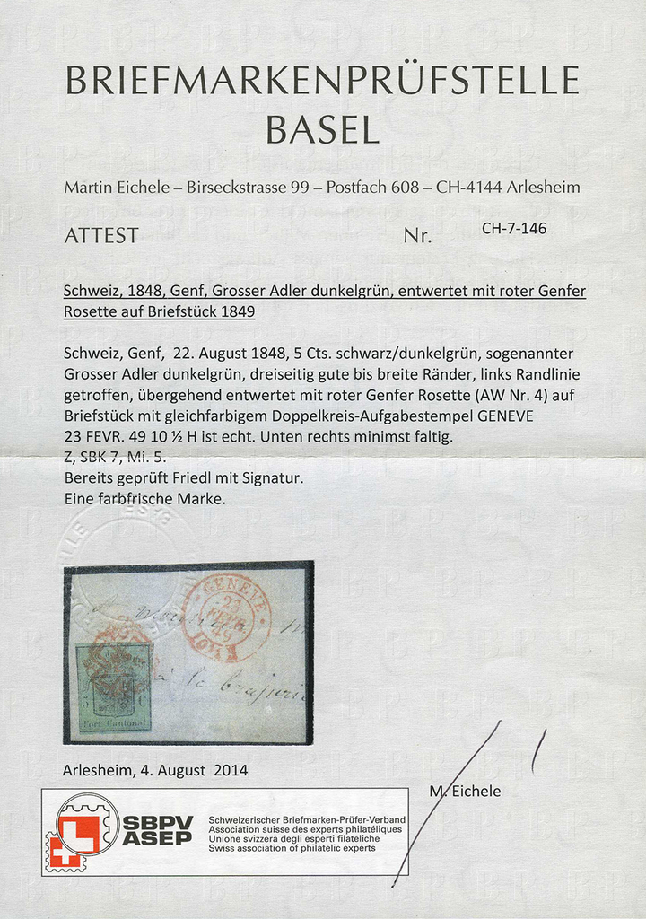 1848, Grosser Adler, dunkelgrün, saubere rote Genfer-Rosette (AW Nr. 4) mit Nebenstempel Geneve, sauber und sehr farbenfrisch, dreiseitig breit- bis überrandig, unten minimst faltig sonst in guter und fehlerfreier Erhaltung