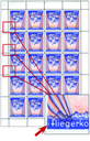 1940, Fliegerkompagnie 9, "Grosser, weisser Putzer neben F von Fliegerkompagnie (1.,5. und 9.Marke), völlig intakter, ungefalteter 20er-Originalbogen mit Passerkreuzen und Perforationsmarkierungen im Bogenrand - seltene Einheit